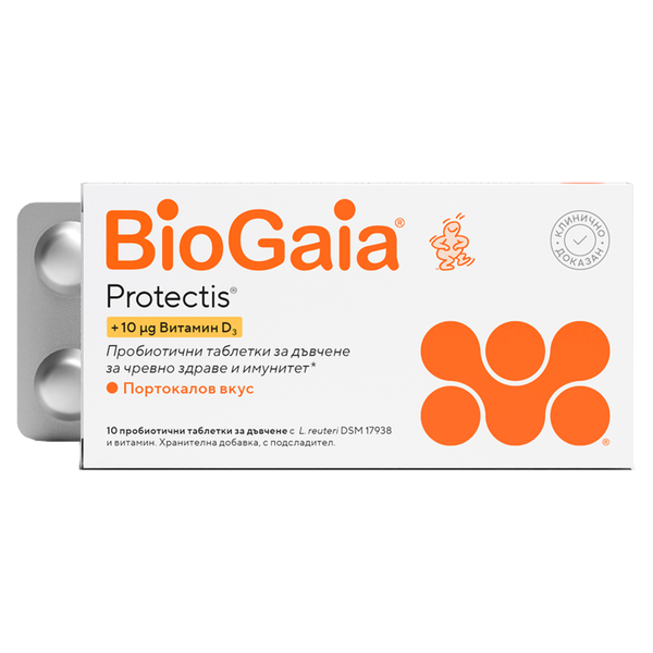 Пробиотични дъвчащи таблетки с приятен вкус на портокал, които подпомагат добрите храносмилателни процеси, като доставят млечнокисели активни бактерии Lactobacillus reuteri Protectis в чревния тракт. С добавен витамин D3, който подпомага имунната защита и правилното функциониране на мускулите и костите. Подходящи за прием при антибиотичното лечение. За възрастни и деца над 2 годишна възраст. Без съдържание на захар, лактоза и глутен.