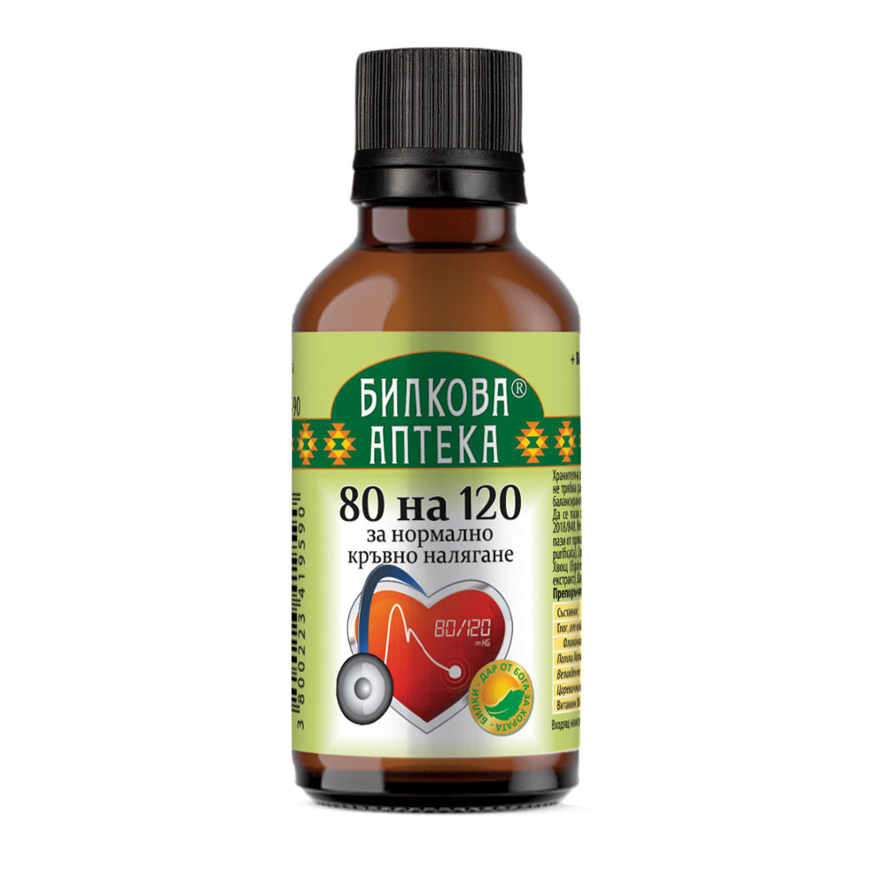 Биохерба Тинктура 80 на 120 е билкова хранителна добавка, разработена за подкрепа на сърдечно-съдовата система. Съдържа балансирана комбинация от растителни екстракти и калий, които допринасят за нормалната сърдечна функция. Формулата подпомага организма при колебания в кръвното налягане. Подходяща е за хора, които предпочитат природни решения. Лесна за прием и подходяща за ежедневна употреба.
