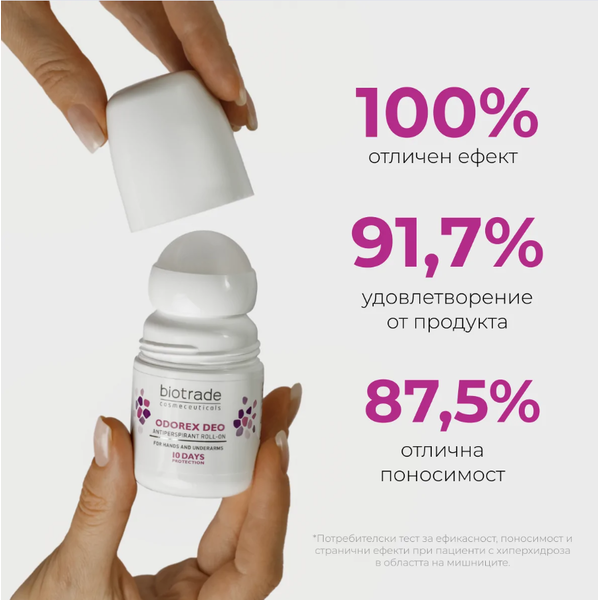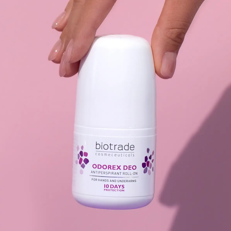 Рол-онът против изпотяване и неприятна миризма на подмишници и длани предлага ефективно действие до 10 дни след едно нанасяне. Този уникален продукт е разработен със специален механизъм, който цели само свръхактивните потни жлези, без да нарушава общата терморегулация на организма.