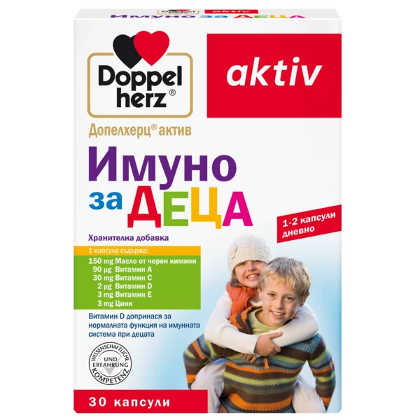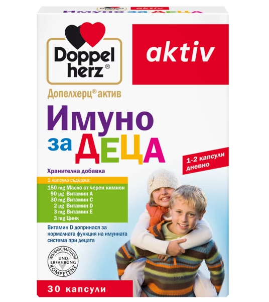 Допелхерц Актив Имуно за Деца комбинира масло от черен кимион, витамини и минерали за пълноценна подкрепа на детския имунитет. Формулата подпомага естествената защита на организма, растежа на костите, зрението и общия тонус, което я прави подходящ избор през есенно-зимния сезон, при посещение на детска градина или при небалансирано хранене.