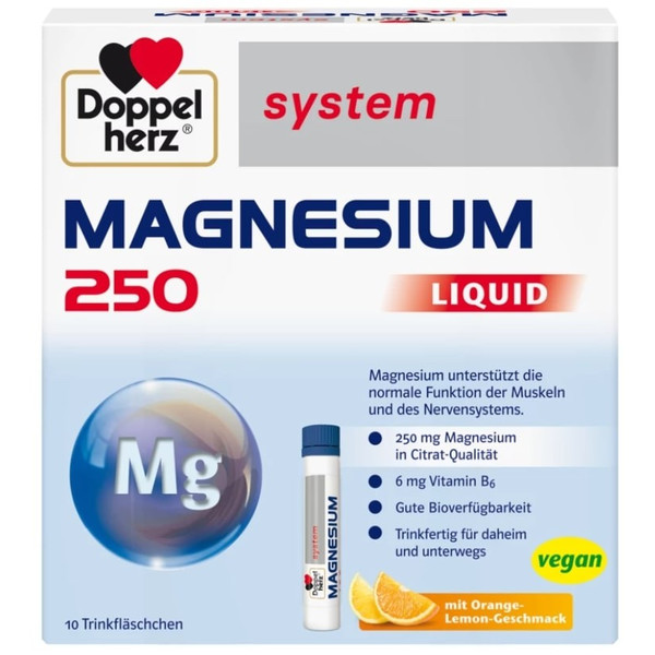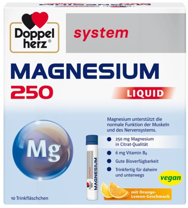 Допелхерц систем Магнезий, е течна формула с 250мг магнезиев цитрат, предназначена за бърза абсорбция и ефективна подкрепа на мускулите, нервната система и енергийния метаболизъм. Подходящ е при активен начин на живот, физическо натоварване и моменти на стрес. Витамин В6 допринася за нормална функция на нервната и имунната система. Течната форма осигурява бързо действие и удобен прием без вода.