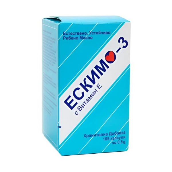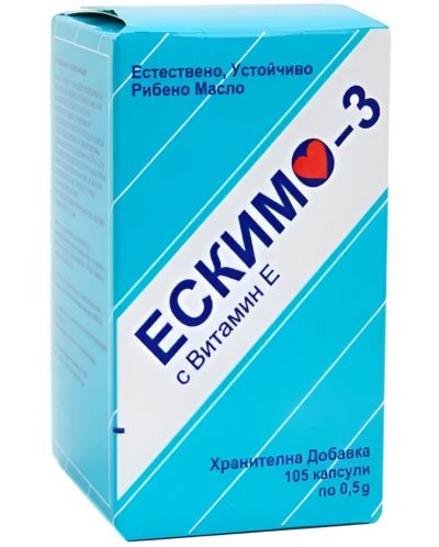 ESKIMO-3 с витамин Е е натурален препарат от устойчиво рибено масло, произведено в Швеция, обогатен с витамин E за комплексна подкрепа на организма. Всяка опаковка съдържа 105 капсули, достатъчни за продължителен прием, и осигурява богат внос на EPA и DHA, двете ключови Омега-3 мастни киселини за сърцето, мозъка, кожата и зрението. Редовната употреба на Омега-3 помага за поддържане еластичността на клетъчните стени, подобрявайки гъвкавостта на ставите и здравето на кожата и кръвоносните съдове. Продуктът е препоръчван в редица състояния, включително дерматози, псориазис, остеопороза и при повишен сърдечно-съдов риск. Добавеният витамин E допълва действието на формулата с антиоксидантна клетъчна защита.