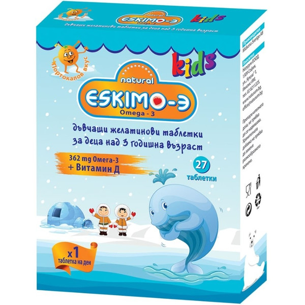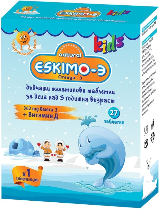 ESKIMO-3 Kids желирани таблетки са ежедневна добавка за деца от 3 години с натурално рибено масло, богато на Омега-3 мастни киселини, витамин D, холин и биотин. Продуктът е разработен специално за нуждите на растящия детски организъм и се отличава с особено висок дял на DHA, основна Омега-3 мастна киселина за нормалното мозъчно развитие и зрение. Ескимо-3 Кидс е пречистен от токсични вещества като живак и пестициди, което го прави безопасен за децата при редовна употреба. Биотинът и холинът подпомагат нормалния метаболизъм и нервната система, а витамин D осигурява правилния костен растеж. Удобната желирана форма с аромат на портокал превръща приема в приятна ежедневна навик.