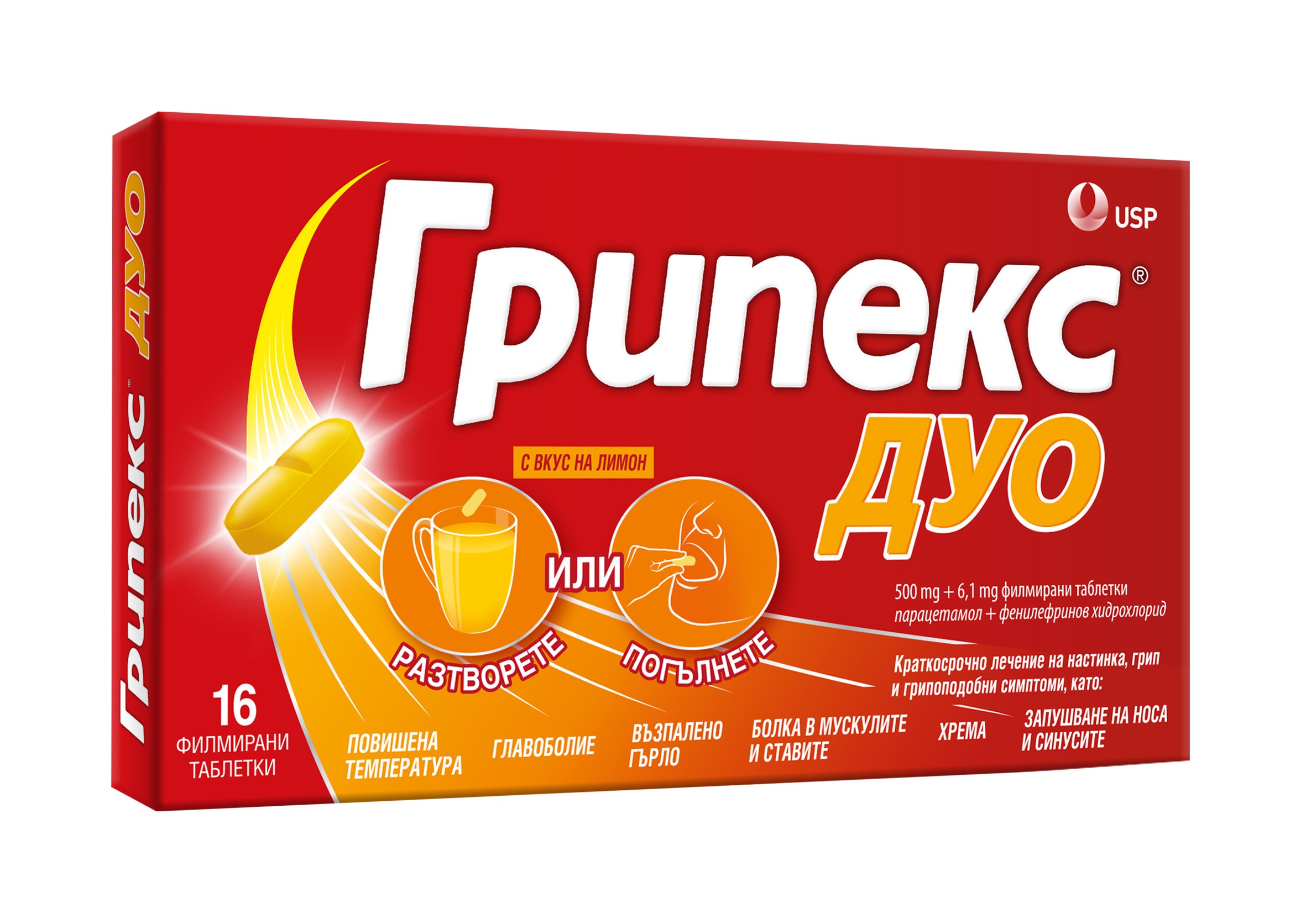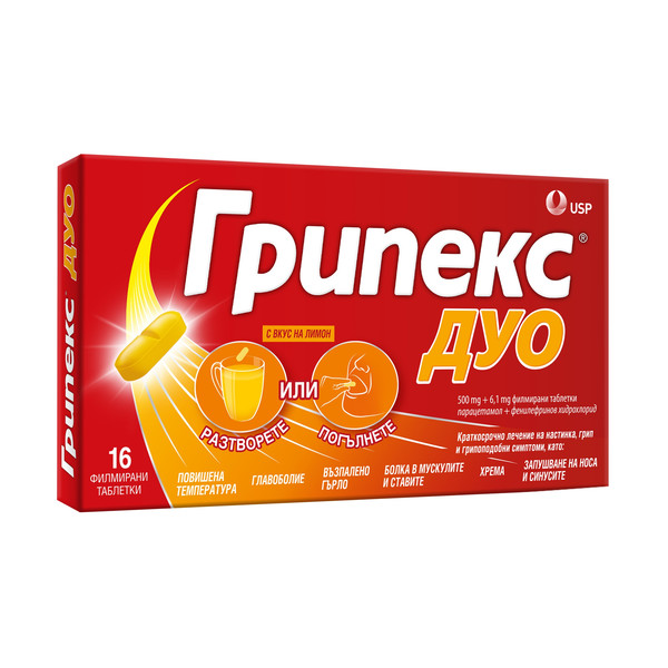 Грипекс Дуо е продукт за облекчаване на остри симптоми при грип и настинка, включително висока температура, главоболие, болки в гърлото и запушен нос. Комбинира парацетамол за понижаване на температурата и облекчаване на болката и фенилефринов хидрохлорид за намаляване на отока в носната лигавица. Удобната форма позволява прием като таблетка или разтвор в топла вода.