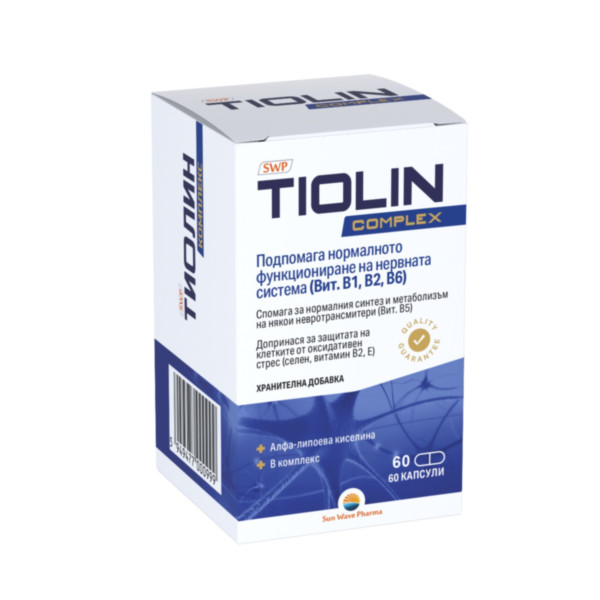 Тиолин Комплекс съдържа специално подбрани съставки с благоприятно въздействие върху нервната система и енергийния метаболизъм. Алфа-липоевата киселина регулира въглехидратния метаболизъм, а полиненаситените мастни киселини поддържат нормални нива на холестерола. Витамините B1, B2, B5, B6 и E насърчават енергийния баланс, здравето на червените кръвни клетки и невротрансмитерите, както и защитата от оксидативен стрес