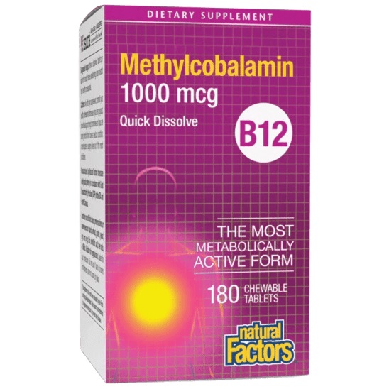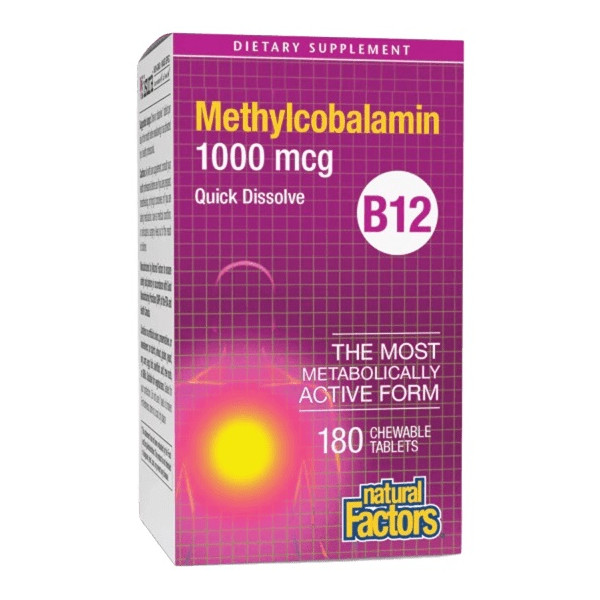 Витамин В12 метилкобаламин на Natural Factors, е хранителна добавка, която подпомага нормалната функция на нервната система, енергийния метаболизъм и кръвообразуването. Формулата е подходяща при умора, напрежение, затруднена концентрация и повишен риск от дефицит при растителни режими на хранене или стомашно-чревни затруднения.